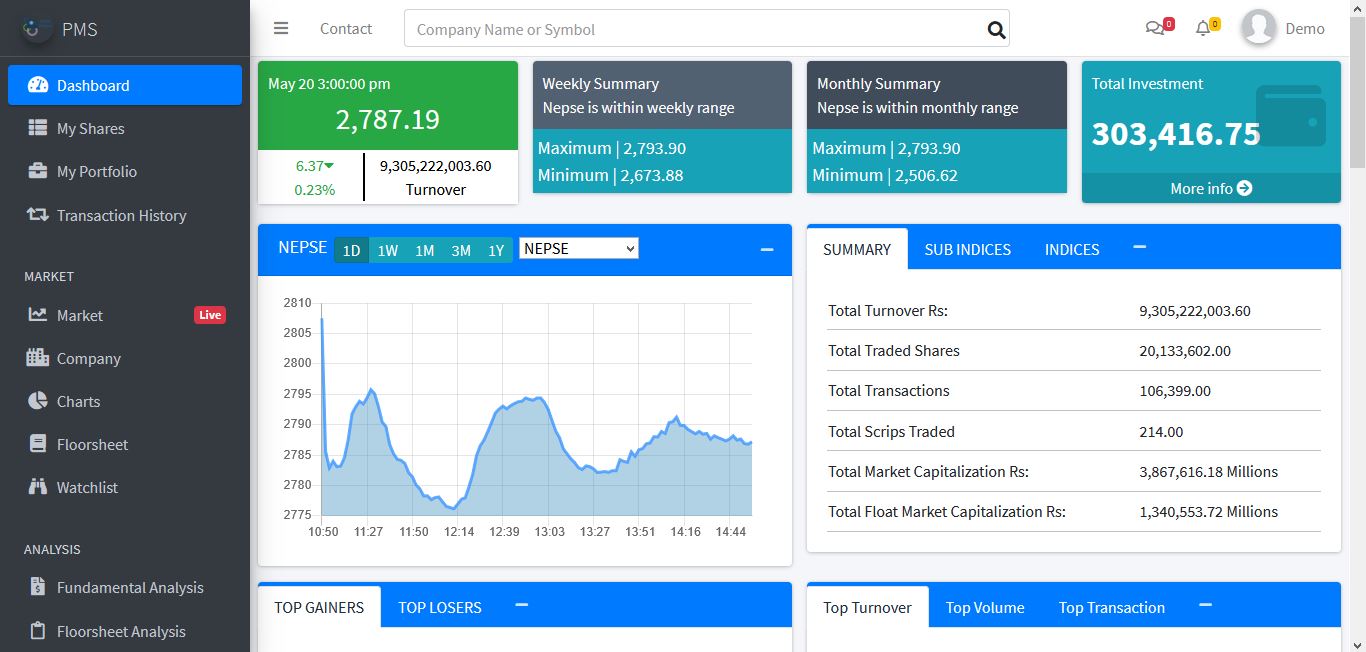 Advance dashboard with basic market summary to all market detail with chart and latest company news.