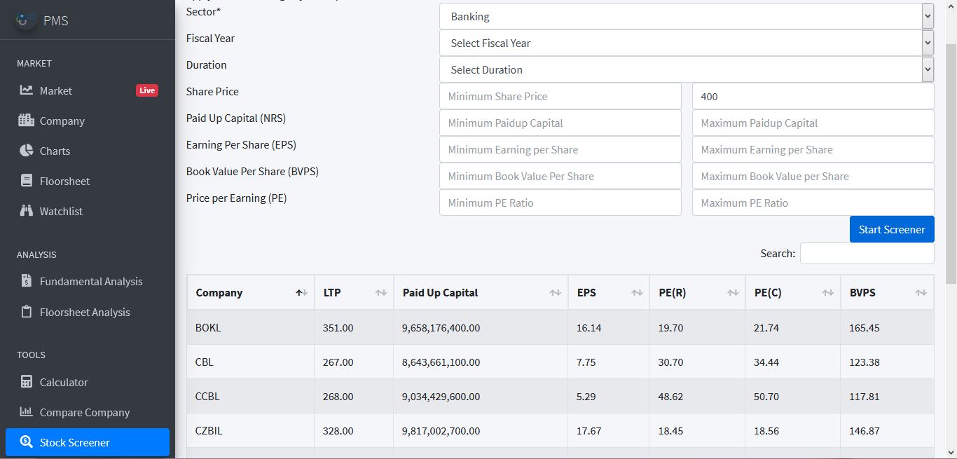 Apply filter according to your requirements like EPS, PE, Book Value and much more and get the company in return.